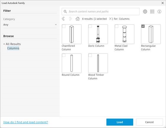 Alternatively, use the "Load Autodesk Family" command from the "Insert" tab on the Ribbon, and then browse to the "Columns" node on the left, and select "Rectangular Column" as shown in the image below.